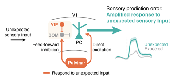 How is this selective amplification of the unexpected sensory input achieved? Vasoactive intestinal polypeptide (VIP)-expressing inhibitory interneurons in V1 receive cortical top-down and neuromodulatory inputs, providing a circuit for top-down gain modulation of sensory responses. The researchers found that VIP interneurons strongly responded to unexpected sensory input but not to expected sensory input. Furthermore, they discovered the pulvinar, a higher-order thalamic nuclei which integrates information from many cortical and subcortical areas and sends prominent feedback projections to V1, also strongly responded to the unexpected sensory input.