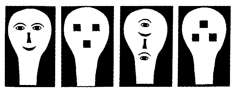 Newborn babies prefer to look at the two face-like images on the left, compared to the scrambled images on the right. This innate disposition helps us learn to recognise faces and interpret facial expressions.