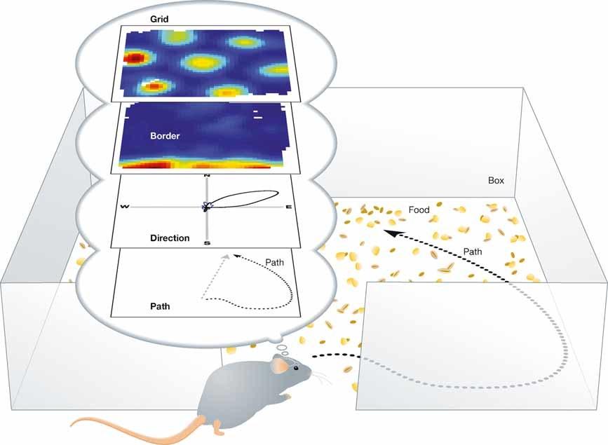 Studies in rodents have revealed neural activity that correlates with the animal’s position relative to the layout of the external environment. These neural representations are thought to guide spatial cognition and perhaps flexible reasoning in general. Image by Edvard and May-Britt Moser.