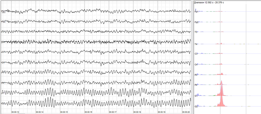 A sample of human EEG with prominent resting state activity - alpha-rhythm. Left - EEG traces (horizontal - time in seconds; vertical - amplitudes, scale 100uV). Right - power spectra of shown signals (vertical lines - 10 and 20Hz). Credit: Andrii Cherninskyi, CC BY-SA 4.0, via Wikimedia Commons