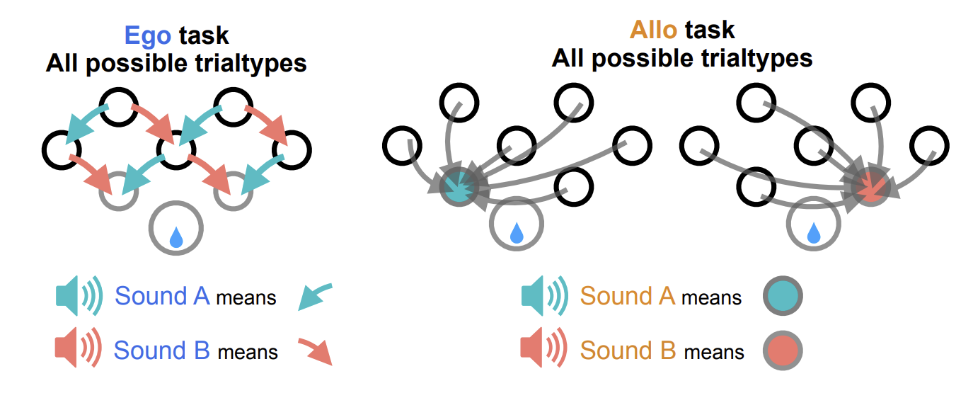 The tasks the team designed required rats to learn to use a poke wall. Animals must choose the correct ports in a task to receive a reward. In the Ego task, after a start port was lit up, one sound cue indicated the correct choice was the port to the left of the starting position, a different sound indicated it was to the right. In the Allo task, after a start port was lit, two different sounds indicated two fixed locations, independent of the starting position.
