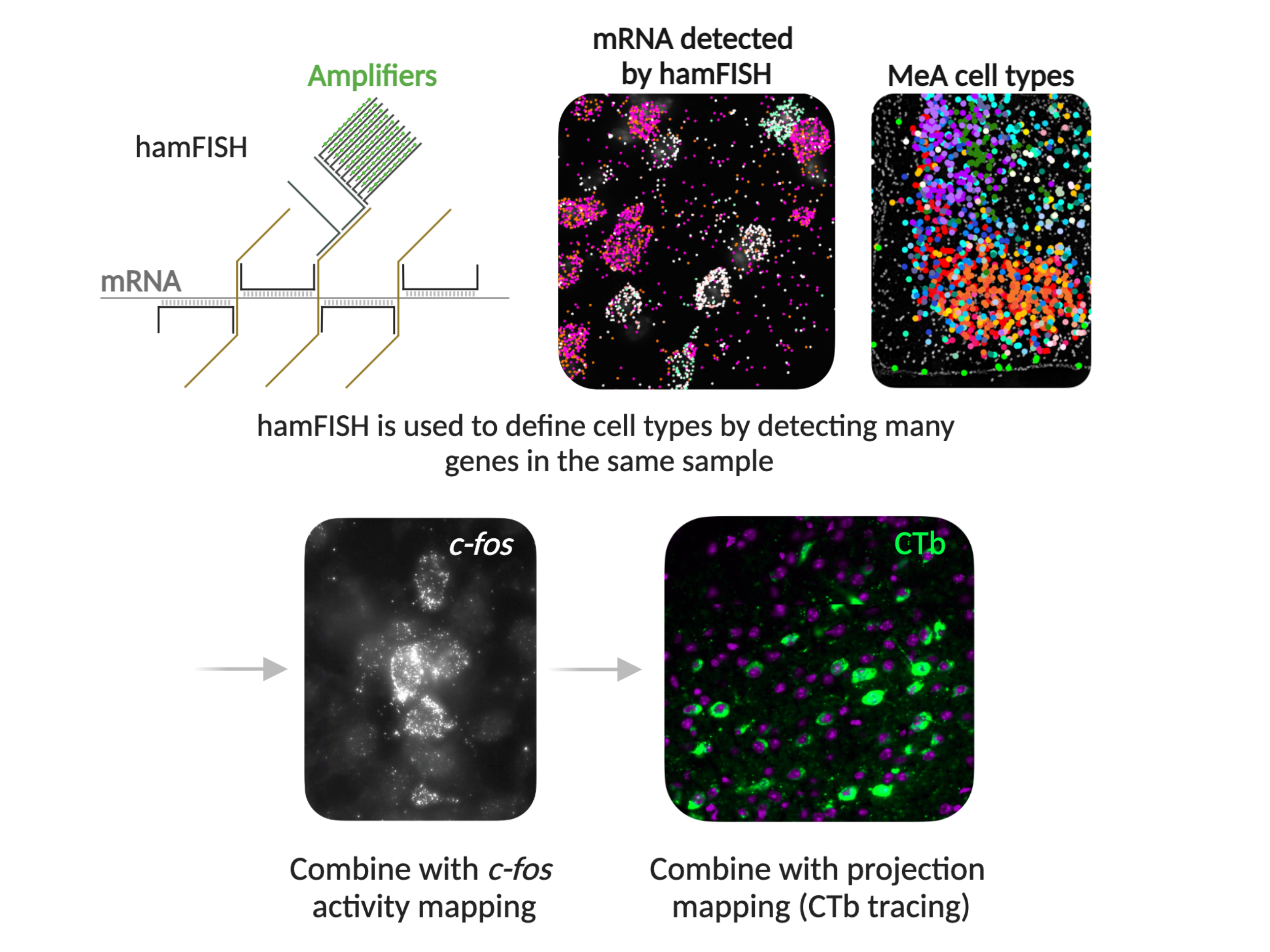 The hamFISH profiling of the MeA provides a proof-of-principle that gene expression data can be overlayed with connectivity information and activity in a behaviourally relevant way.