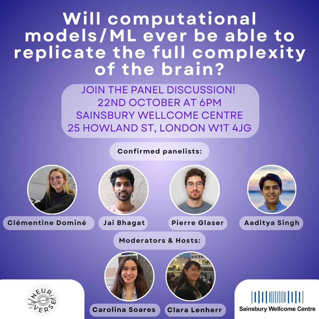 Join us on October 22nd at 6 PM for a thought-provoking panel discussion hosted by the Sainsbury Wellcome Centre and Neuroverse. This event will delve into one of the most relevant questions of our time: Will computational models and machine learning ever be able to replicate or fully capture the brain's complexity?