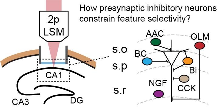 During spatial behavior, hippocampal place cells can selectively respond to specific locations in an environment. While the contribution of distinct excitatory input pathways in generating these firing patterns is slowly unfolding, little is known about the role of local inhibitory networks in supporting these representations. Here, I will present how I attempted to address this question in 2 steps. First, I develop a method using volumetric random-access two-photon calcium imaging and retrospective molecular identification to map in vivo activity dynamics onto major interneuron classes of the mouse hippocampal area CA1 during head-fixed exploration and learning. Second, I used in vivo single-cell electroporation to perform monosynaptic rabies tracing in CA1 pyramidal cells, and imaged the functional properties of the postsynaptic neuron and its local presynaptic inhibitory ensemble during navigation. I found that the spontaneous emergence of place fields does not originate from either a global or unitary decrease in inhibition levels. I am now investigating how the local presynaptic interneurons influence the stability of postsynaptic place field.
