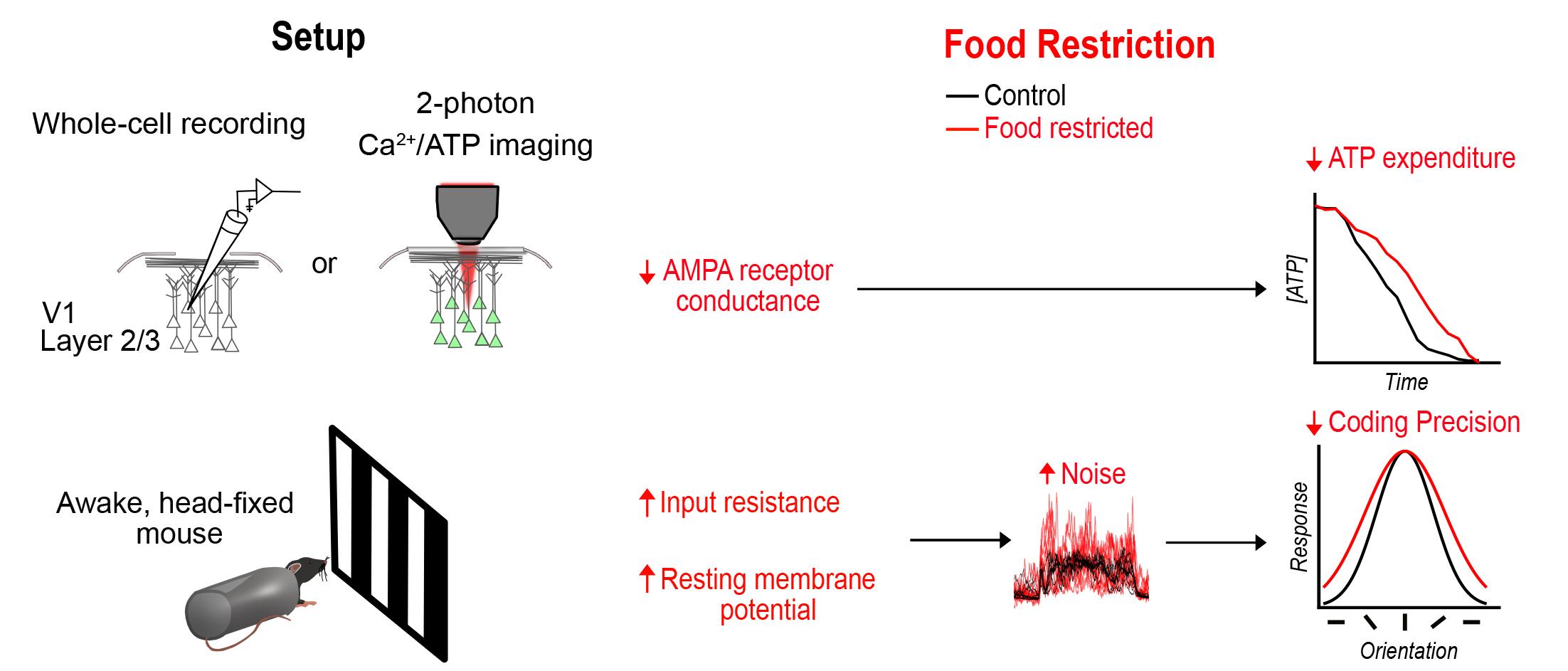 Summary Figure. Food restriction results in ATP savings at the expense of coding precision in mouse visual cortex. (Left) Experimental setup. (Right) Cell intrinsic changes with food restriction result in energy savings and broadened orientation tuning.