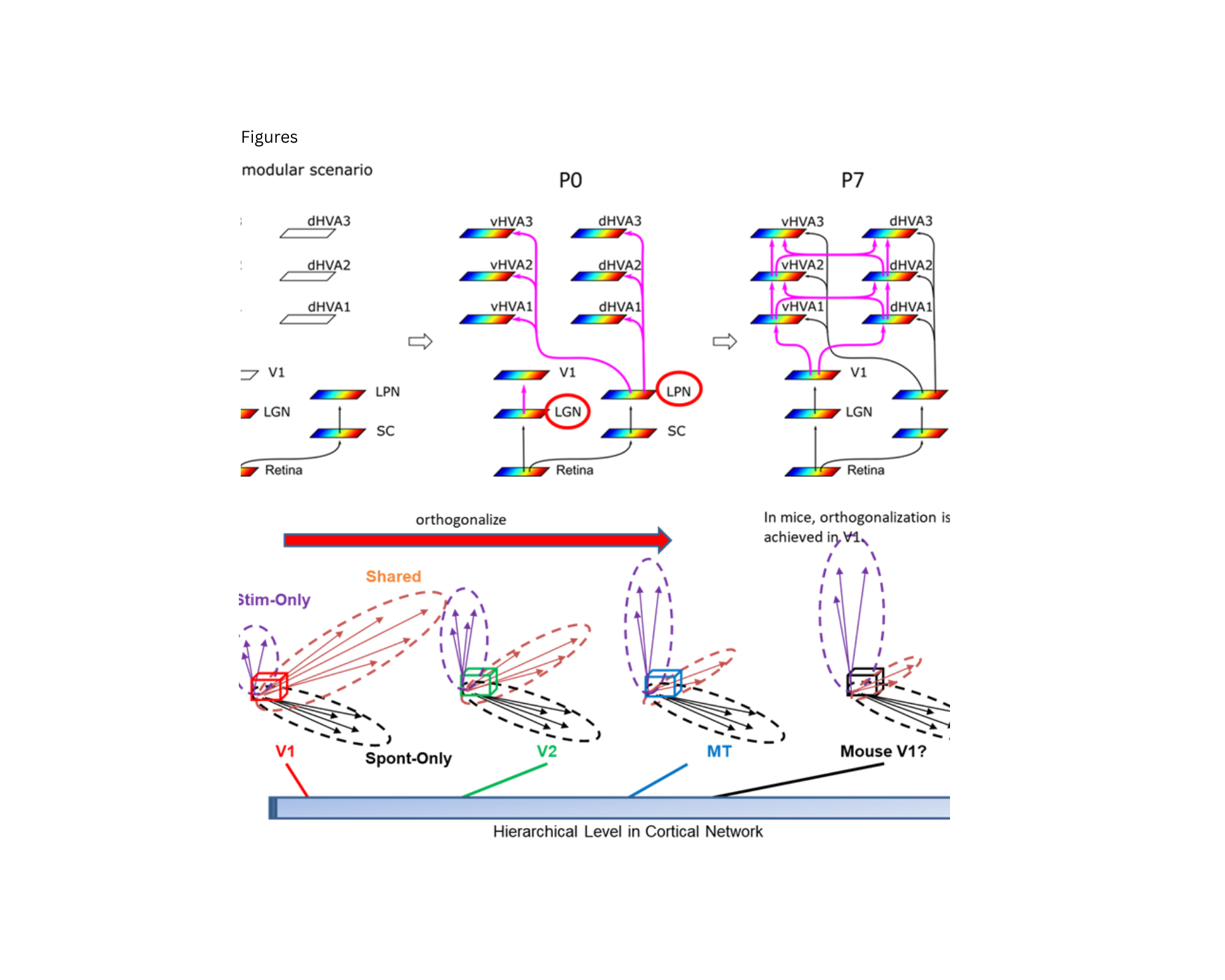 During development, the visual network is not formed strictly in a step-by-step hierarchical sequence. Instead, parallel modules linking the retina, thalamus, and multiple visual cortical areas first emerge. In mice, pathways from the retina to primary visual cortex (V1) and higher visual areas are established through lower- and higher-order thalamic nuclei before corticocortical connections appear. These modules are later linked by corticocortical connections to form a hierarchical cortical network. Retina-driven intrinsic activity contributes to establishing retinotopic organization across these modules (Murakami et al., 2022).