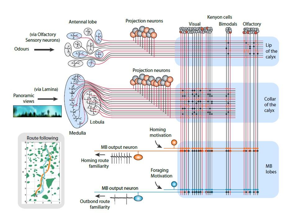 Insect navigation has been a focus of behavioural study for many years, and provides a striking example of cognitive complexity in a miniature brain. We have used computational modelling to bridge the gap from behaviour to neural mechanisms by relating the computational requirements of navigational tasks to the type of computation offered by invertebrate brain circuits. We have shown that visual memory of multiple views could be acquired by associative learning in the mushroom body neuropil, and allow insects to recapitulate long routes. We have also proposed a circuit in the central complex neuropil that integrates sky compass and optic flow information on an outbound path and can thus steer the animal directly home. The models are strongly constrained by neuroanatomy, and are tested in realistic agent and robot simulations.