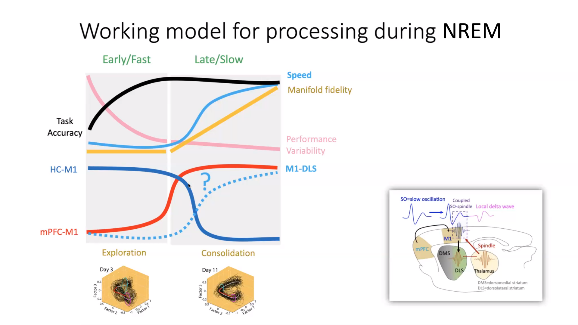 Our most recent efforts have tried to understand how the broader brain network drives skill learning. The plot below shows our current view on how processing during sleep changes across brain areas with practice. We have found that there are apparent transfers from cognitive areas (HC, mPFC) to motor areas (M1) during sleep. This transfer seems to be related to when each animal ‘gets’ the task. After this, we see the slower motor learning phase kick in (‘manifold consolidation’). Prior to this the animals seem to be exploring how to do the task. Thus, we think that NREM sleep is used to replay past activity to determine whether a skill should be formed, or instead allow an animal to remain in an early state of exploratory learning.