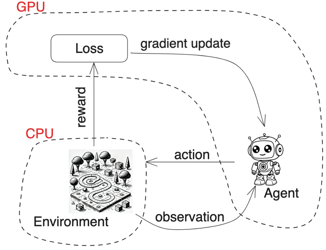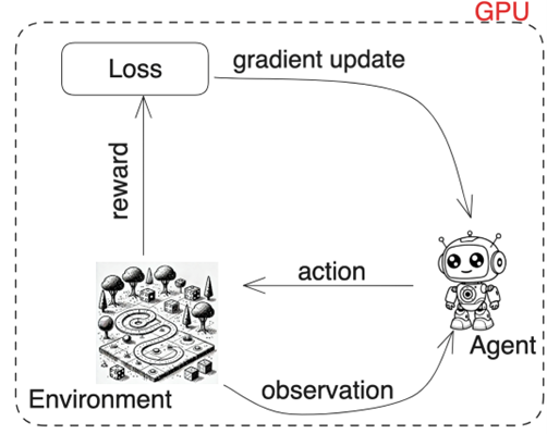 This allows us to write not just the algorithm in terms of the agent that has taken actions and learning, but also the environment in that same GPU-accelerated framework code. This means we can get rid of all the complexities associated with having to pass data between the GPU and the central processing unit (CPU), which makes algorithms slow and engineering-heavy.