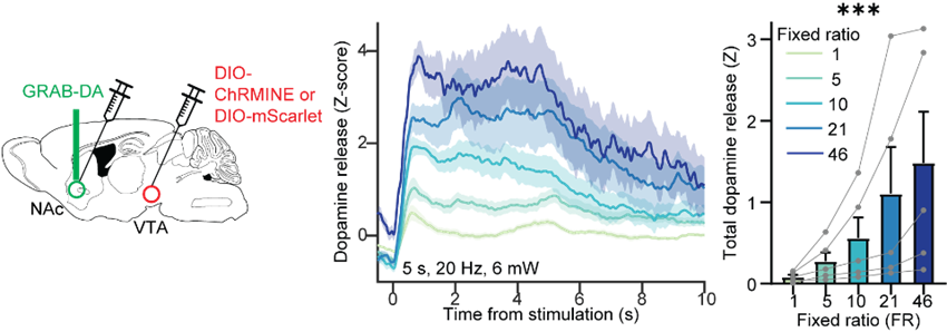 At the same time, we could record dopamine release second-by-second using a technique called fibre photometry and this genetically encoded dopamine sensor called GRAB-DA. While mice are performing this task and poking different numbers of times to gain access to a reward, we are recording the dopamine release during the task in response to those rewards. That’s how we mapped all of these parameters onto dopamine experiments.