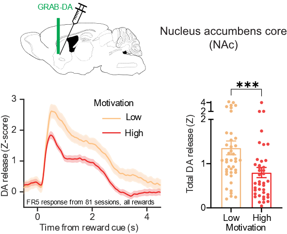 The other interesting finding is that in high motivational states, when the animal is more willing to work hard for a given reward, compared to lower motivational states, in which the animal gives up more rapidly, I see a nice mapping of that onto dopamine release. But it happens in the opposite way that I expected. In high motivational states, there seems to be lower rapid dopamine release in response to rewards. And we’re still working on what that could mean and what mechanisms might come into play, or how that happens.