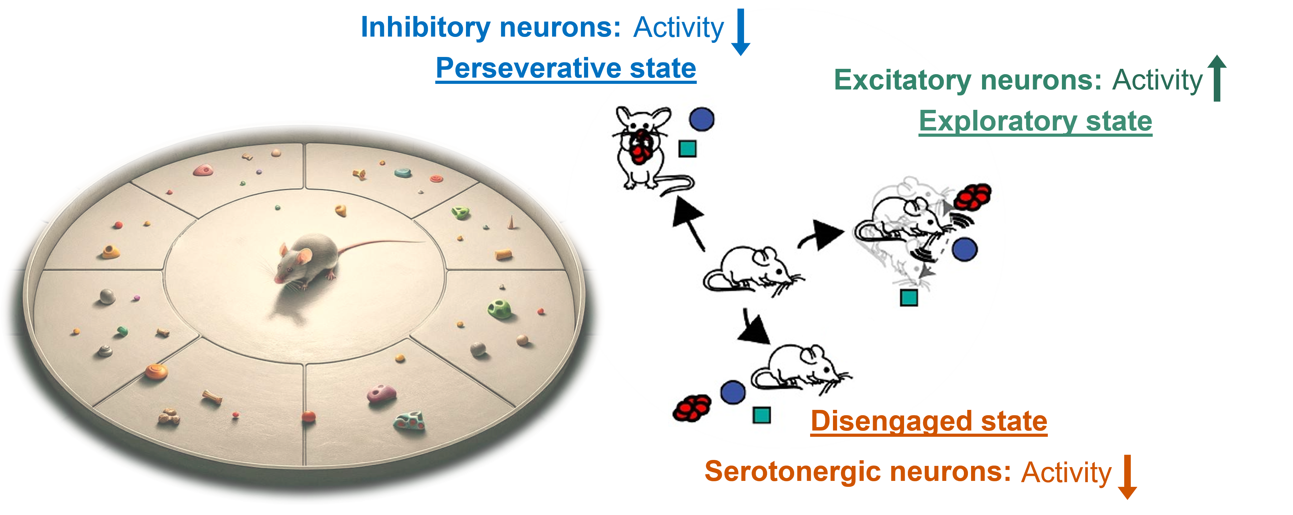 Researchers have revealed neural circuits in the brainstem that are crucially involved in implementing decisions by controlling three fundamental behavioural states or strategies: perseverance, exploration and disengagement. The circuits revealed in this study in mice may help to further understand a number of neuropsychiatric conditions including obsessive-compulsive disorder (OCD), autism and major depressive disorder.