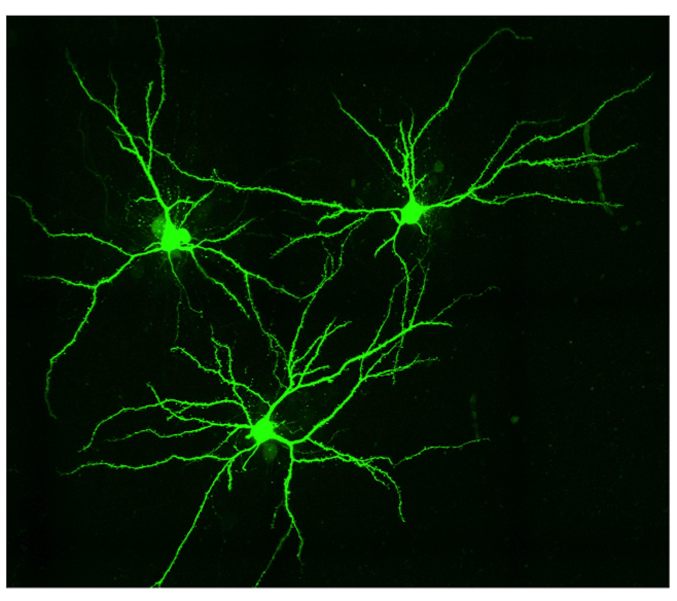 These are amygdala neurons that are filled with fluorescent dye so that we can analyze neural structure in 3D.